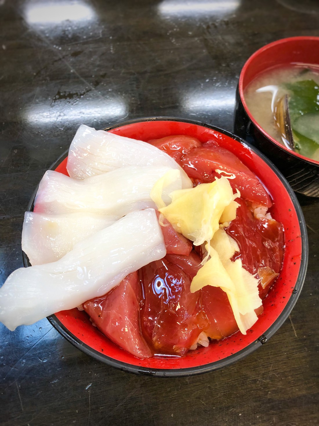 イカマグロ漬け丼(600円)大シジミの味噌汁(100円)